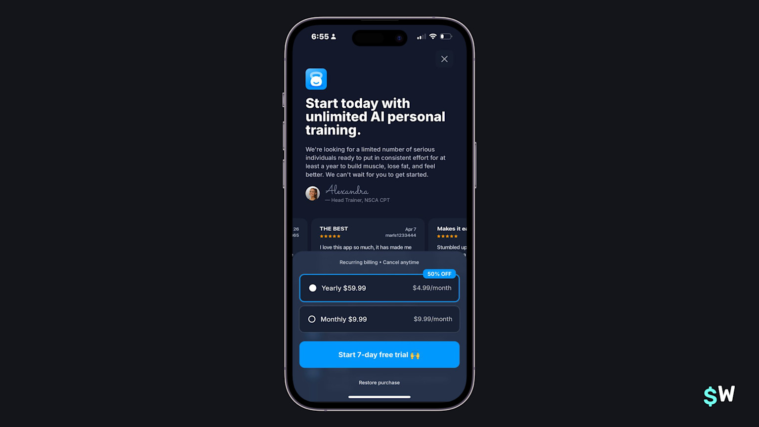 Planzera leverages a powerful technique: social proof. By including happy user's reviews right within the paywall, Planzera reinforces the primary value add of its plan — that it will help you achieve your training goals. Also of note, the "🙌" emoji, which can really work in call-to-action buttons if it fits your app's voice and tone.