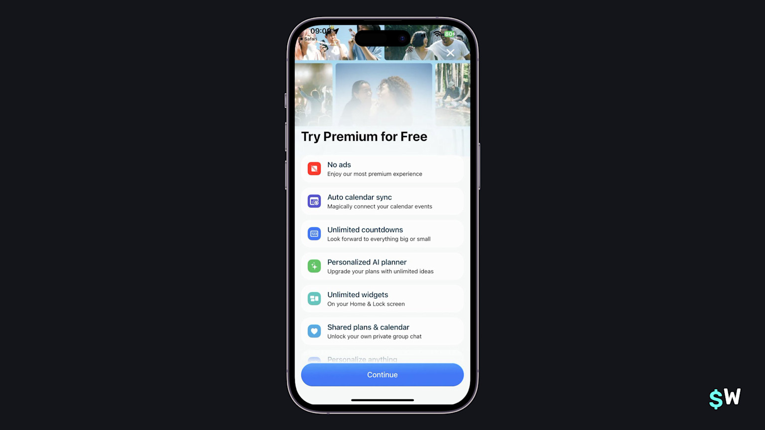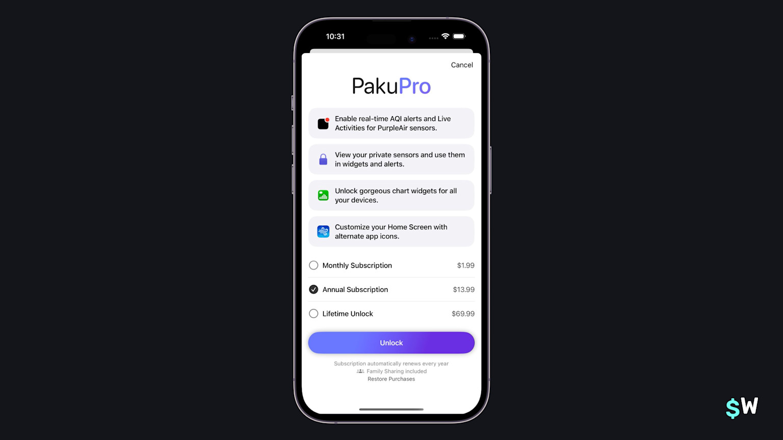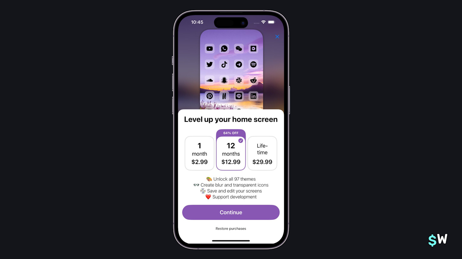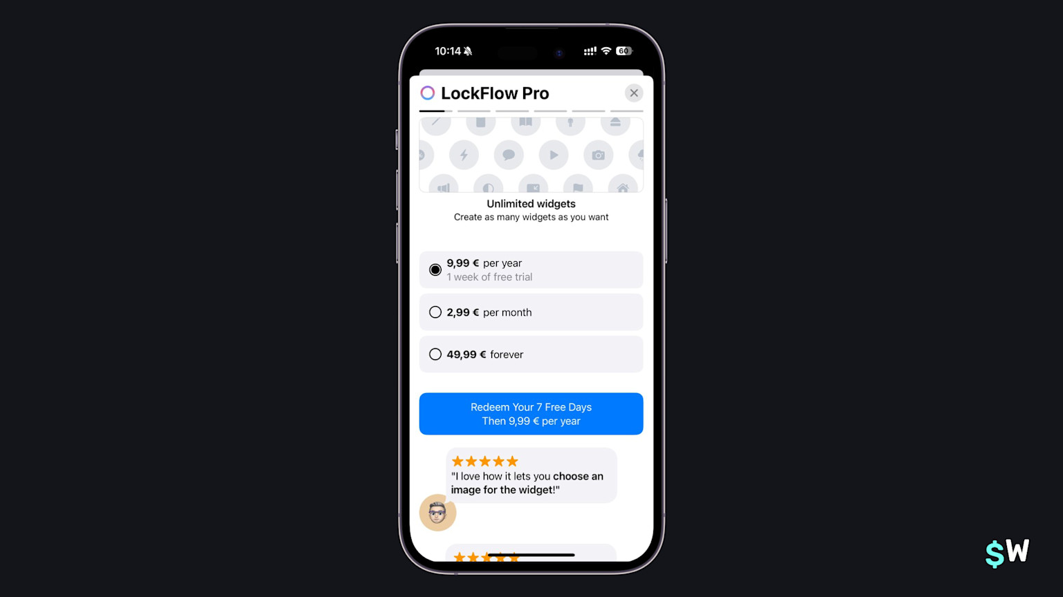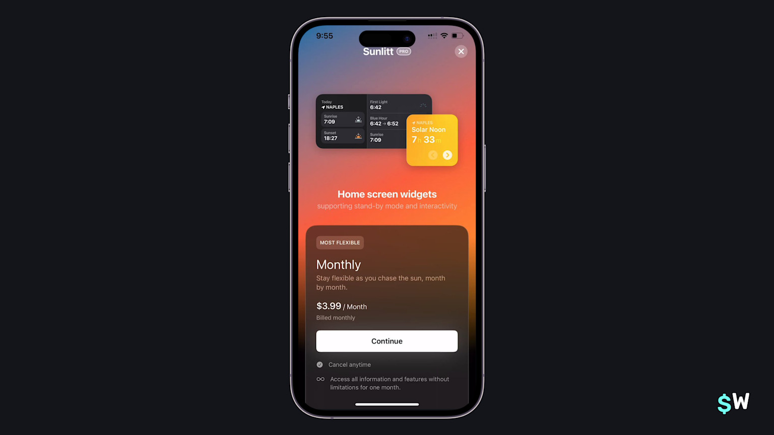 One of Sunlitt's primary value propositions is the use of widgets. Similar to Goalkit above, they reinforce that notion by including a widget right into the paywall. If your app has a unique angle to push, taking a similar approach can be an effective way to increase conversions (or trial starts).