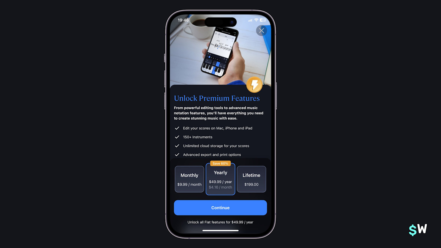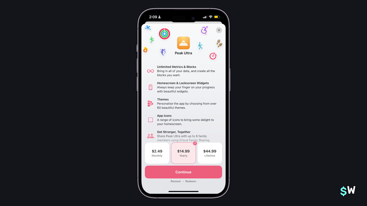 Peak combines the "feature list" with all pricing options. As we saw earlier, the light gradient above the purchase buttons invite users to check out more benefits. Overall, Peak leverages its app voice effectively by incorporating iconography that's prominently used in other parts of the app's user interface. A fun little addition is the verified-esque badge showing on the top-trailing side of the selected plan.