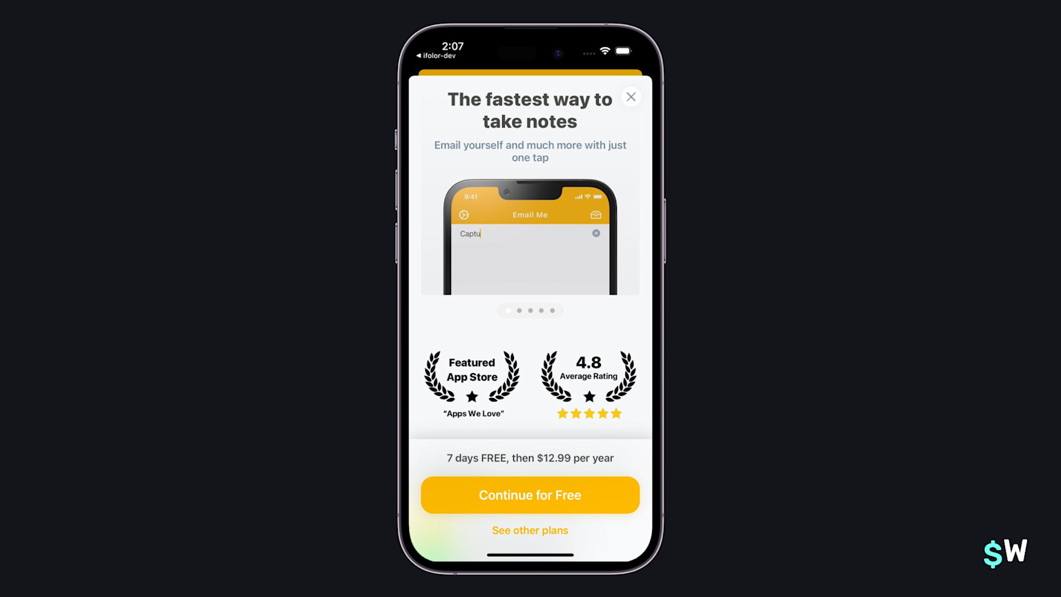 Email Me also uses a form of social proof beyond including App Store reviews — it shows off Apple's seal of approval by mentioning it's been featured. That, along with a high average rating, is a great way to instill user confidence. Along with a feature carousel, it lists out trial and pricing details in clear terms above the button, which allows the button's text to say something else. In this case, "Continue for free" is a strong call-to-action.
