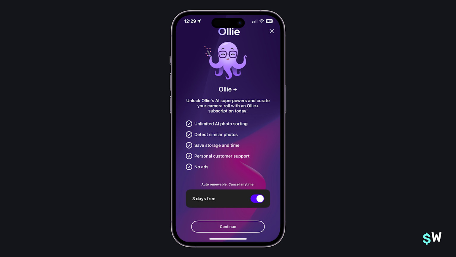 Ollie pushes its branding effectively. Its developer, Keepbox Inc, leverages its octopus mascot in its App Store screenshots as well (and, I'd assume, in any advertising they may do). Of note, Ollie includes the trial toggle with a "Continue" call-to-action button with text that changes depending on the toggle. When it's off, it reads "Not sure yet? Enable free trial" to encourage that route.