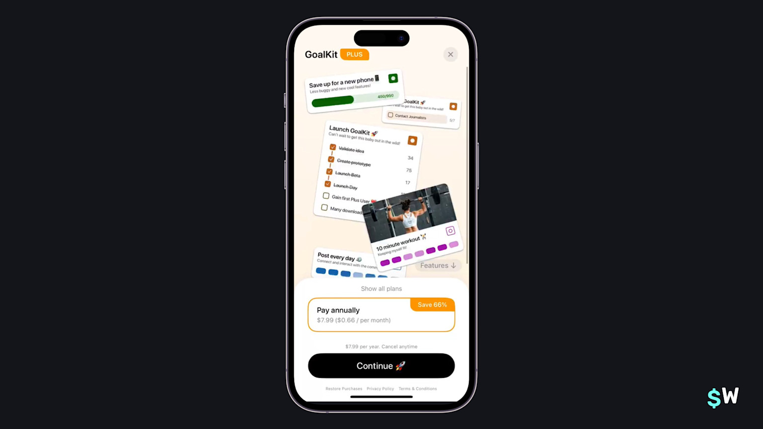Goalkit takes what I call the "UI chunk" approach. Here, designers pick out core, recognizable parts of the app's user experience, and then show those within a paywall. This helps users clearly understand how they might fit the app into their life, even before they've used it. And again, we see the use of emoji for the call-to-action text.
