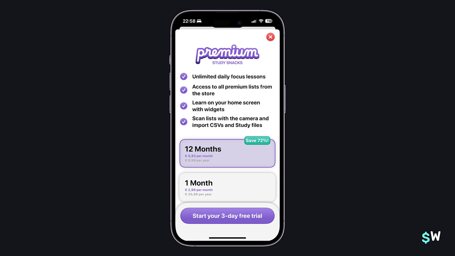 Study Snacks encourages users to check out its annual plan by showing how much more they'll save in comparison to its monthly plan. Similar to how some apps will show an annual plan, but what it equates to monthly below the text, placing a "Save X%" amount serves the same purpose. The savings are more obvious to some users when presented in a percentage-based fashion, as Study Snacks has done here.