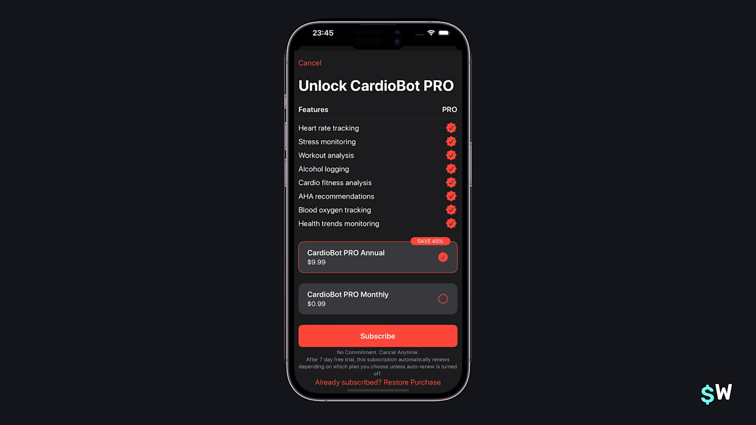 Cardiobot is a great example of how paywalls can use a culmination of effective ideas together. We've seen paywalls with the feature list, pricing discounts on yearly plans and viewing all plans together in a lot of these examples. Here, Cardiobot shows how its possible to do all of those things together.