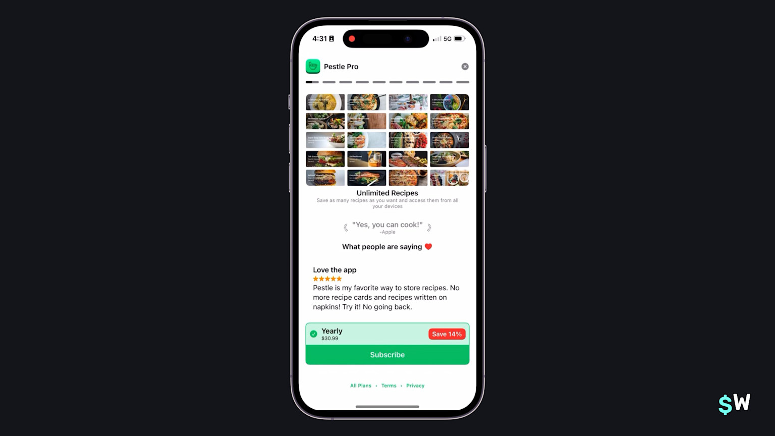 Pestle takes a "stories" approach. At the top, you'll see the easily understood "story lines", which work as they do on most social media apps. Each feature is a story entry, and they are automatically toggled through. This can be an engaging and novel way to show off your subscription's best features.