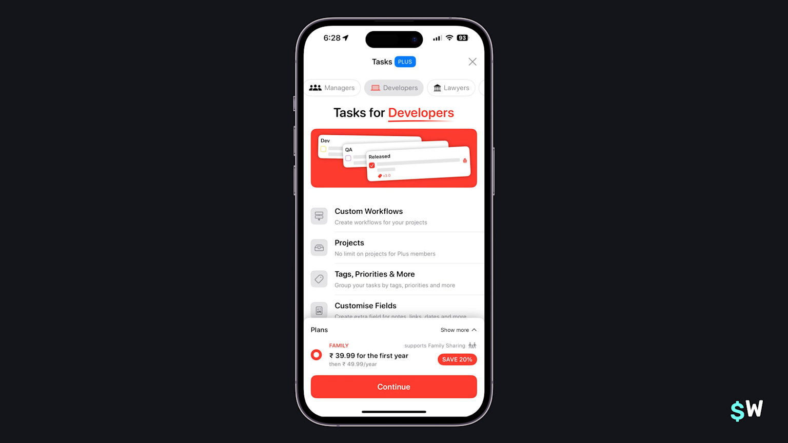 Tasks takes a pointed approach: the use case scenario. Since Tasks can be used for several different purposes, it tailors its paywall to show how each of those common use cases can be solved by using the app. The toggle at the top changes out the text and color scheme (a nice touch) for each scenario and, overall, it's a good lesson in how paywalls can work well when an app has a large surface area of uses.