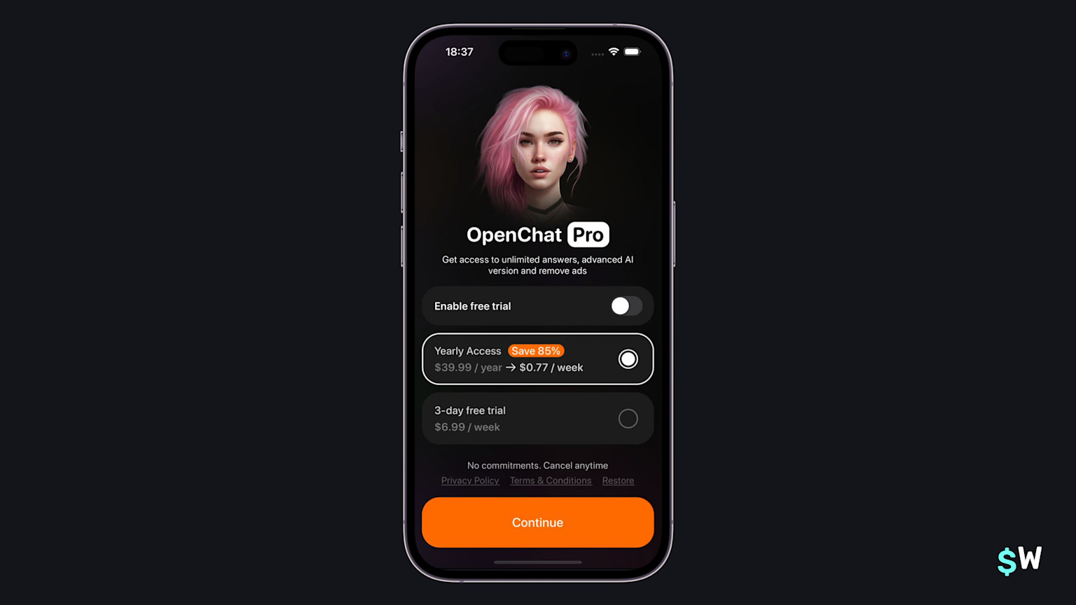 OpenChat uses the free trial toggle approach. This user experience can help point people to a particular plan. Here, the toggle automatically selects the weekly plan below. Even though its selectable on its own, the toggle reinforces the notion that the trial is included when this plan is chosen.