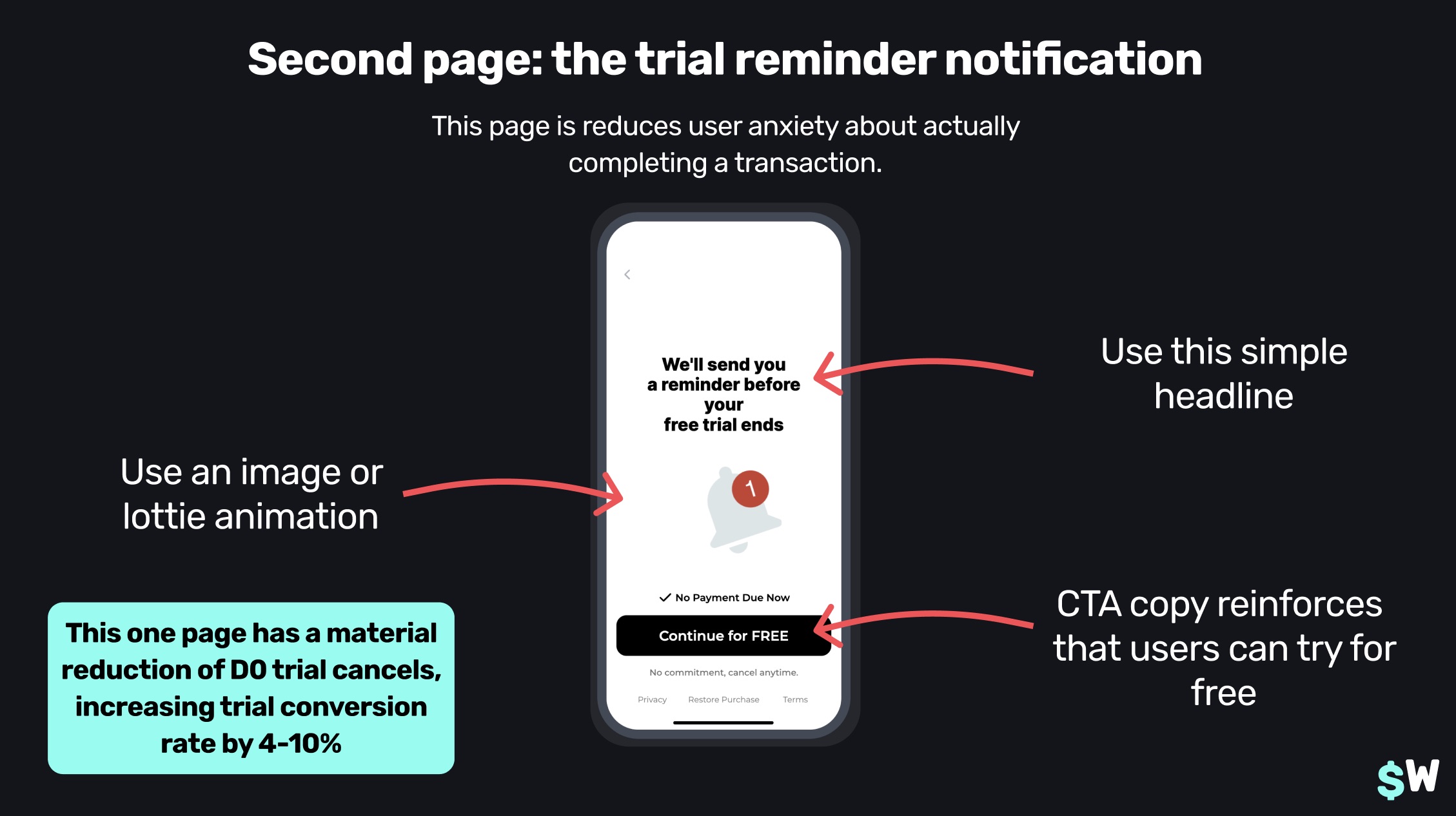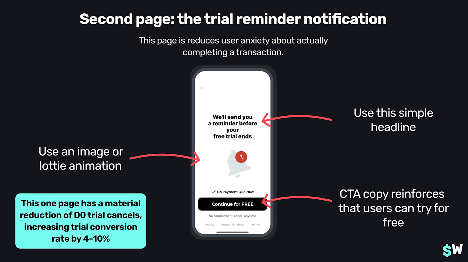 The trial reminder page is critical. Why? It reduces the number of users who immediately cancel a trial after they start one. This user behavior is prevalent across iOS, and this is your best weapon against it. If they know they'll get a notification, they feel less risk.