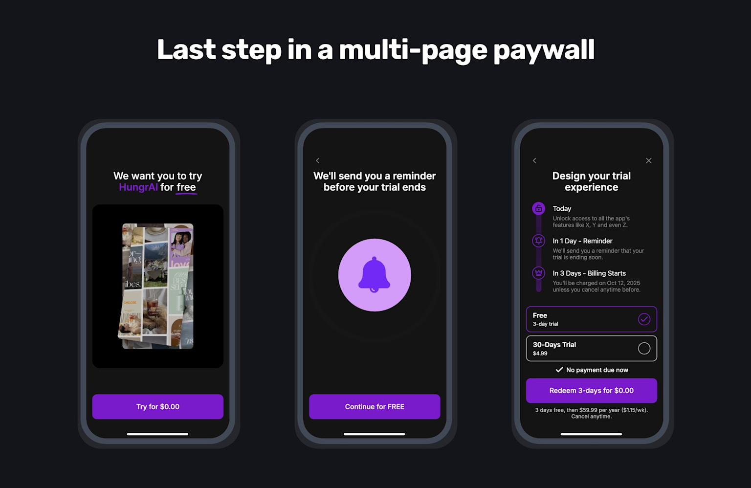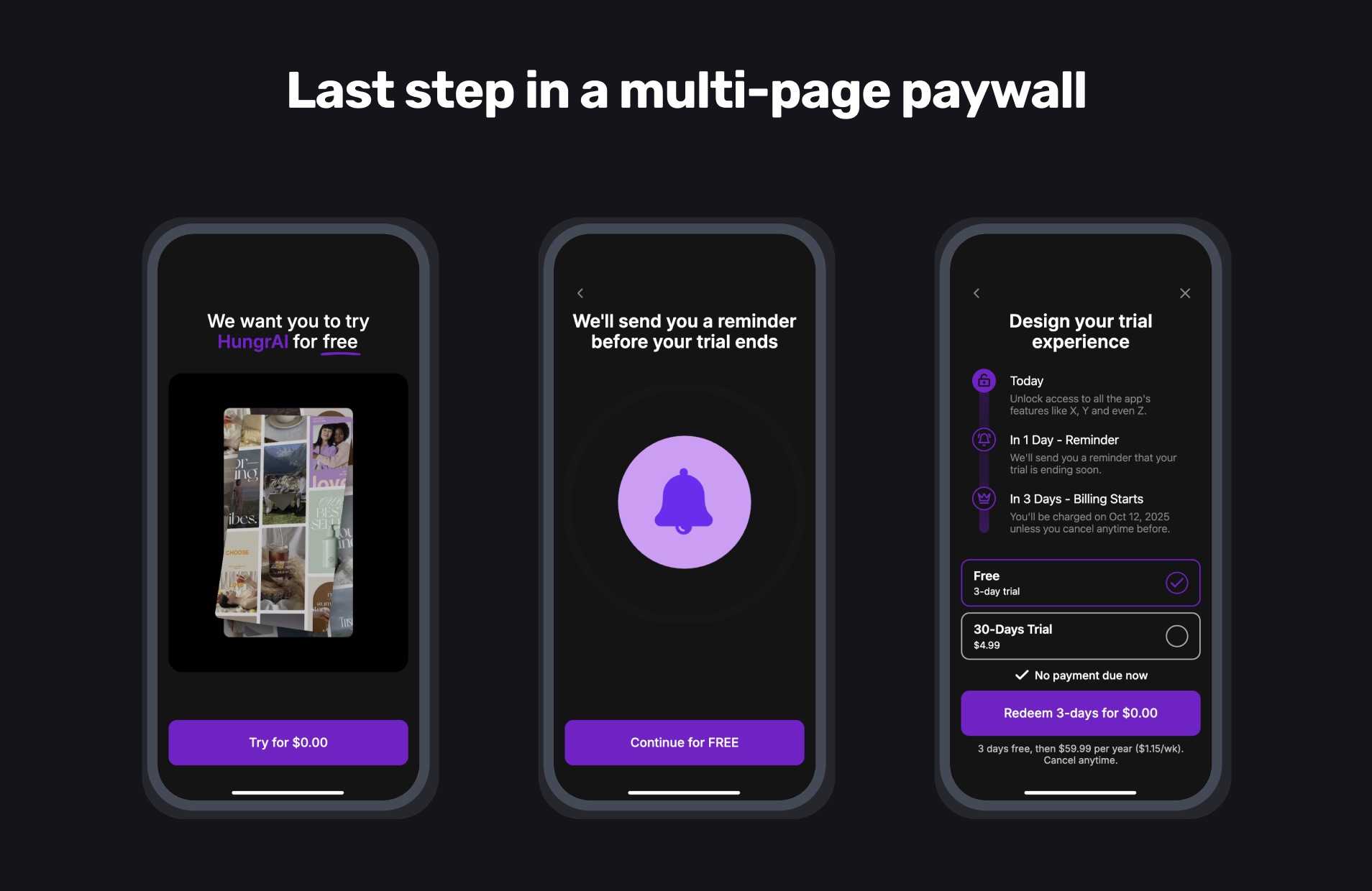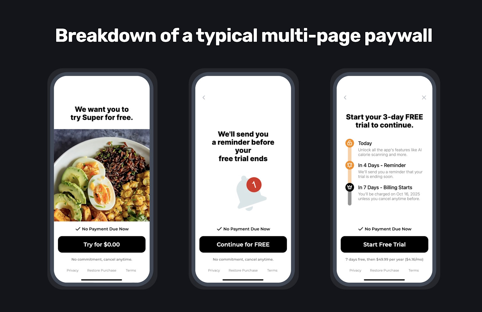 Typically, Nick recommends three or four steps in this paywall flow. Each step is there to reduce a user's anxiety about starting a trial or purchasing a subscription. The key here is to create a tight narrative, and reduce cognitive load. We've found that spreading out critical information across a few steps help user's understand value propositions better, reduce trial anxiety, and feel more confident in what they're purchasing: