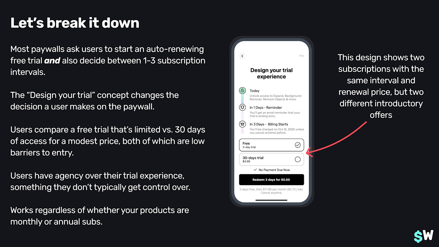 Now, here's a great one to test today — combining both of these together! With the trial-reducing impact of multi-page paywalls, their reduction in cognitive load paired with the user's power of choice in designing their trial, we arrive at this approach: